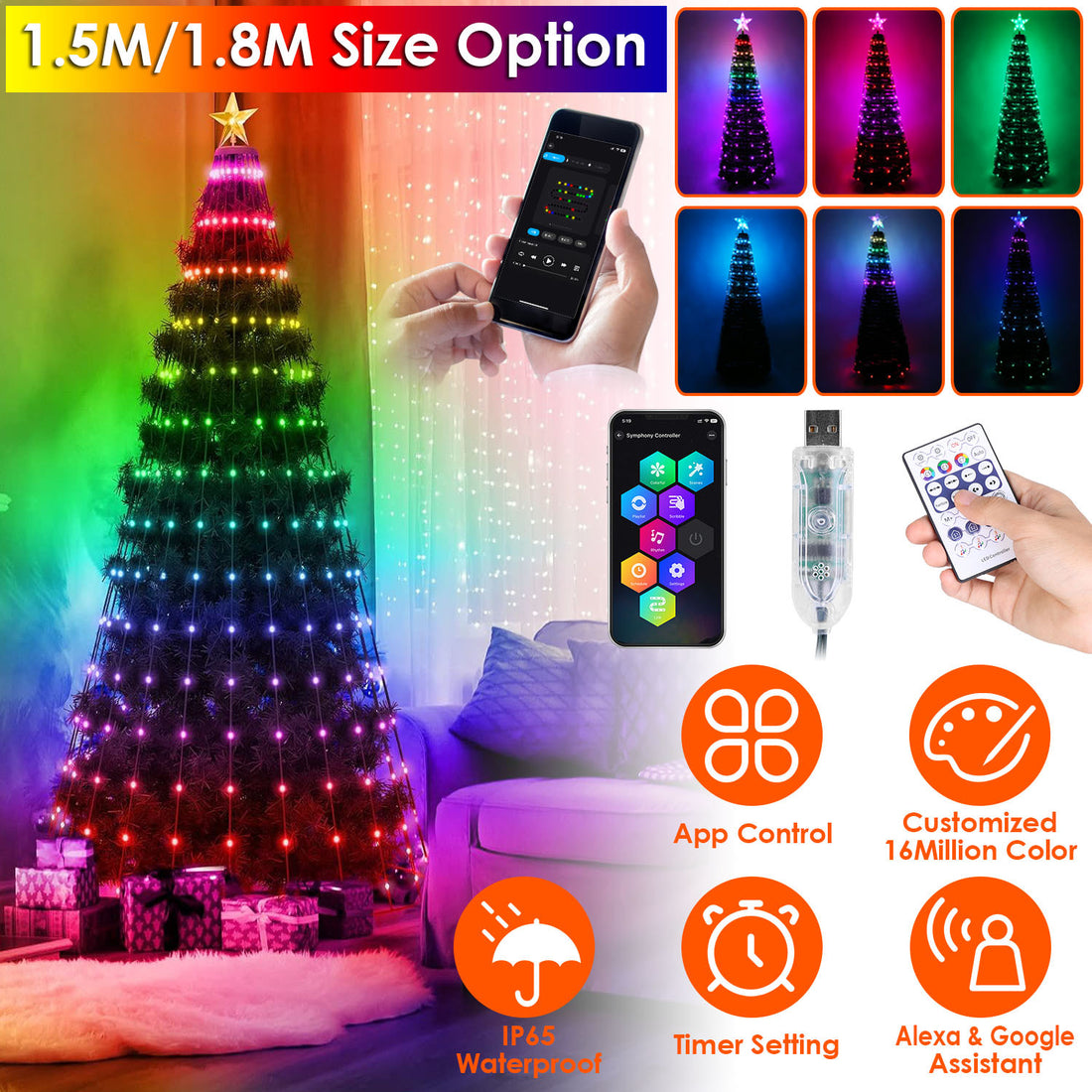 4.9FT S-5.9FT L Options -- 1Pc Collapsible Christmas Tree Light With Remote App Control IP65 Waterproof Customized Multi-Color Mode Timer Setting Work With Alexa Google