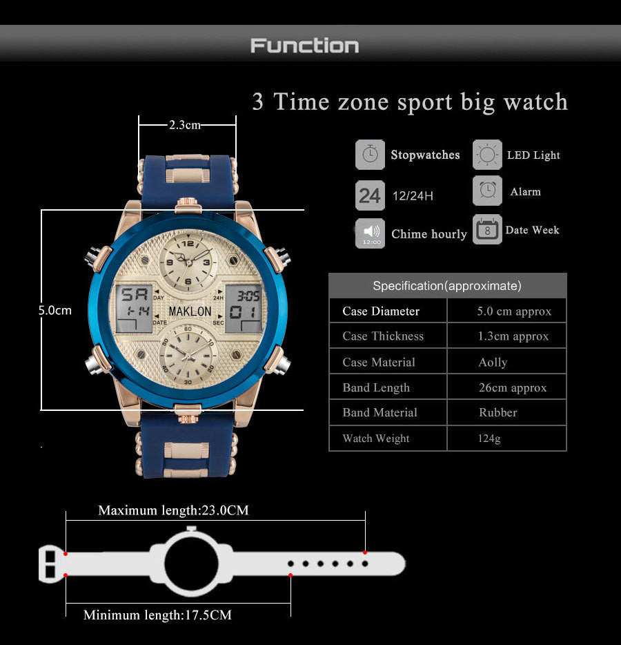 Dial Domineering Military Watch Dual Movement Dual Display Luminous Sports Watch Multi-Function Watch Waterproof MAKLON