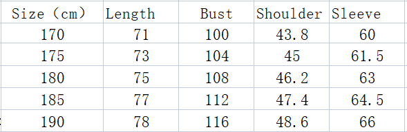 Size: 170/M, 175/L, 180/XL, 185/XXL, 190/XXXL