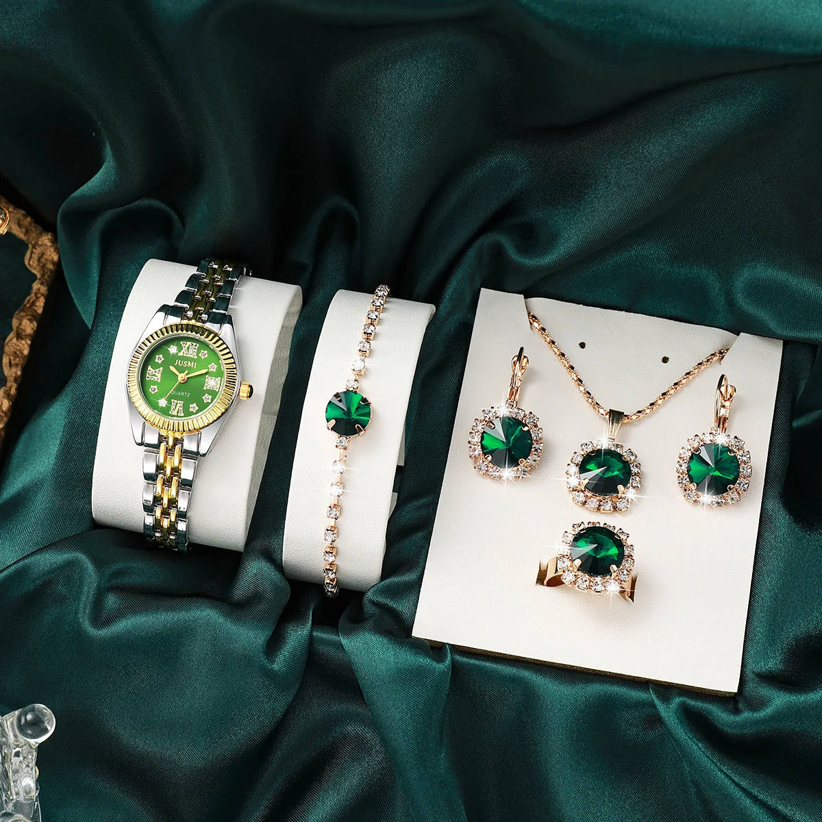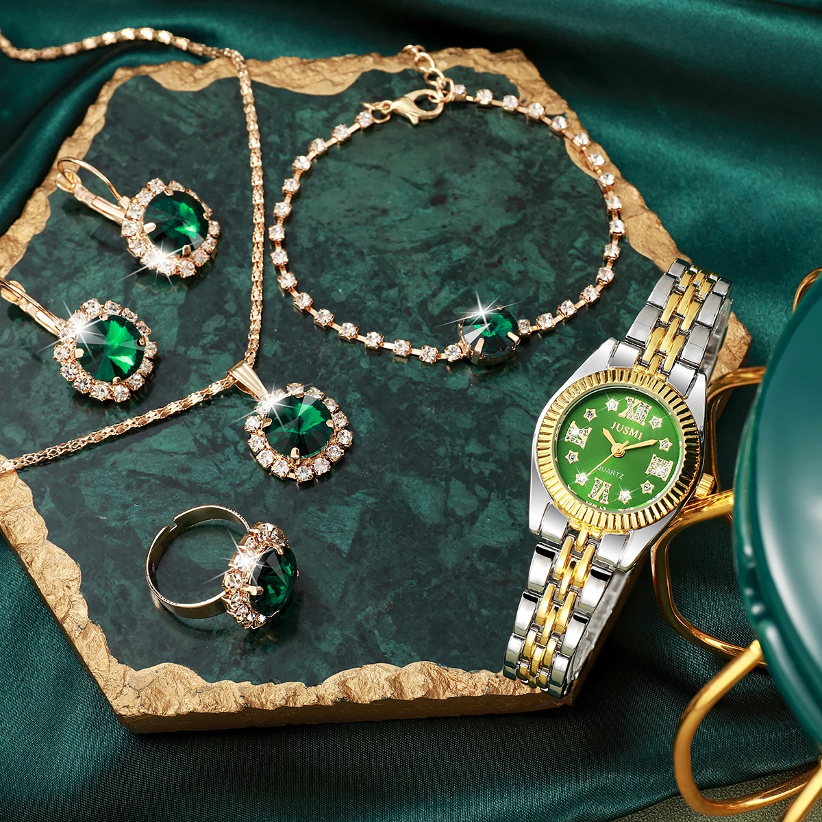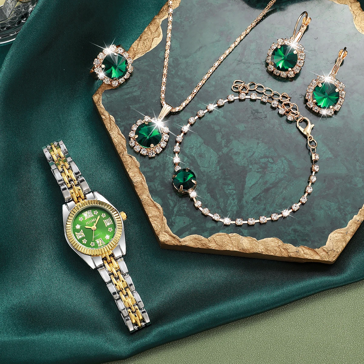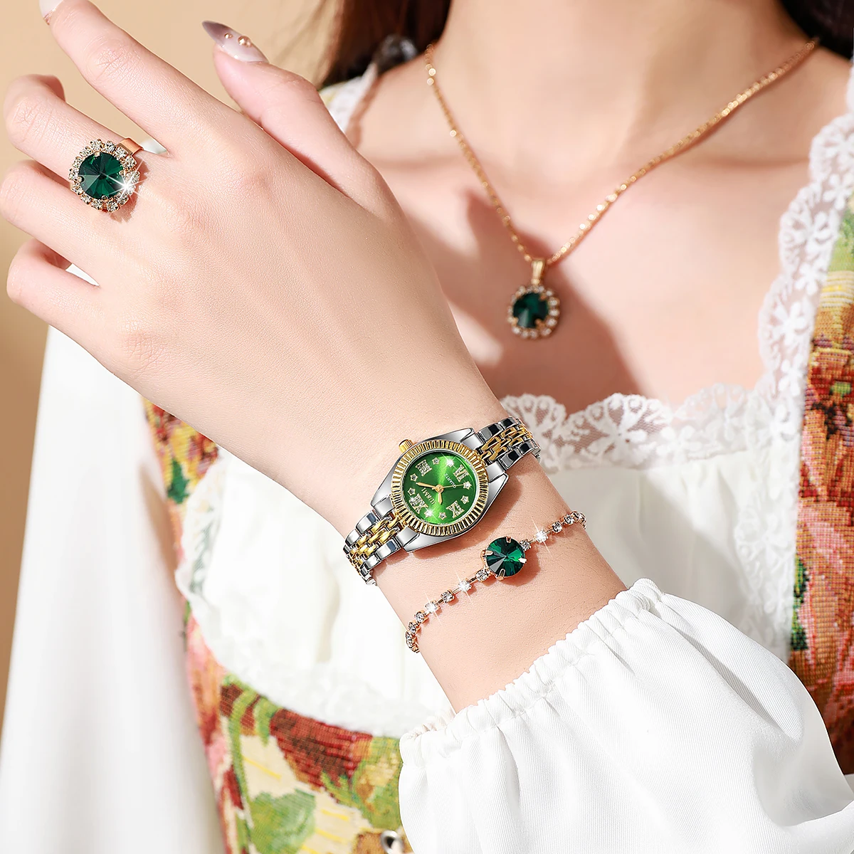 No gift box; Shell batch flower dial with diamond inlaid and gradient gold strap ladies' watch full diamond jewelry 5-piece