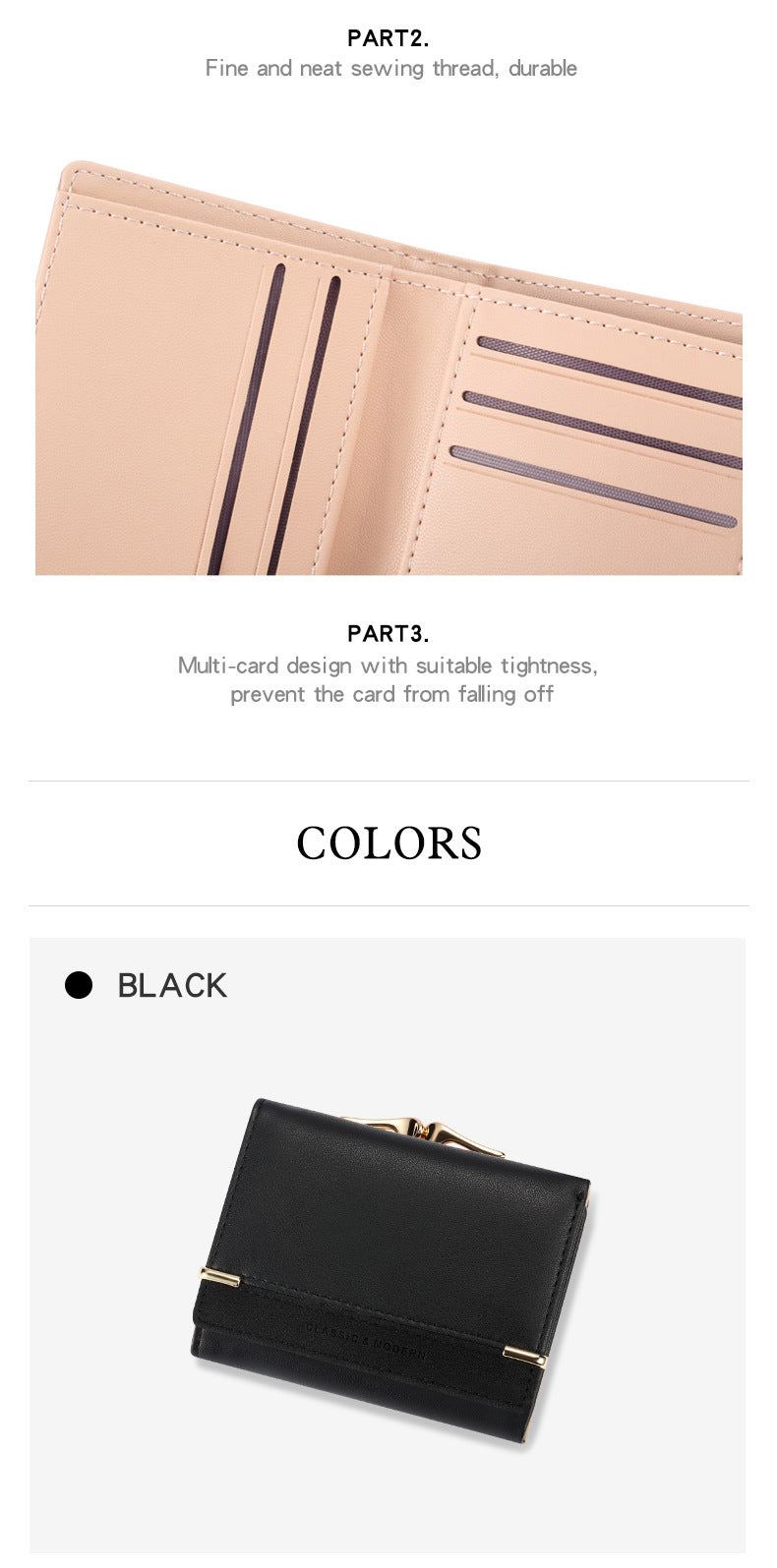 Internal structure of packet: hidden compartment, big bill folder, photo slot, change slot, certificate slot and card slot.